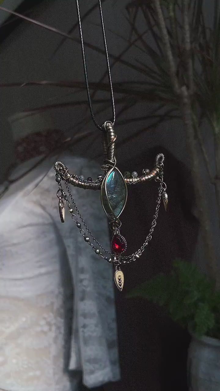 This unique pendant features a stunning labradorite centerpiece, wire-wrapped in an antique silver finish. Accented with a garnet drop and delicate chain detailing, this piece is both eye-catching and subtly sophisticated. It is a perfect statement piece for everyday wear or special occasions.