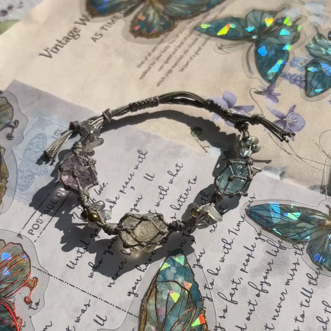 This unique bracelet features a mix of raw stones, hand-woven onto a durable cord. The subtle shimmer and natural variations in the stones make this bracelet truly one-of-a-kind. Perfect for everyday wear or special occasions.