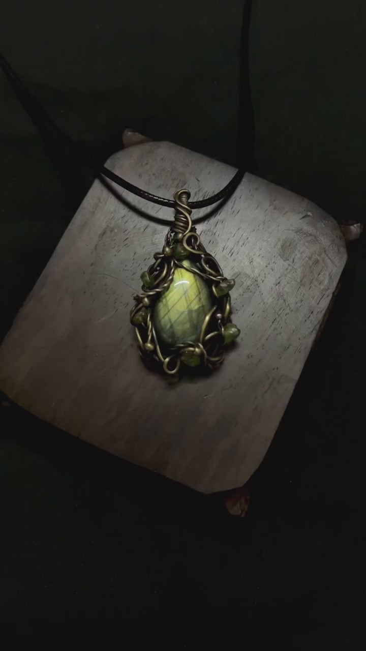 Labradorite, known for its mystical properties and captivating iridescence, takes center stage in this enchanting pendant. A richly hued golden labradorite gemstone is lovingly wrapped in antique bronze wire, creating a piece that's as alluring as it is magical. Wear this piece to connect with your inner wisdom and embrace your unique power. Presented on a black leather cord.