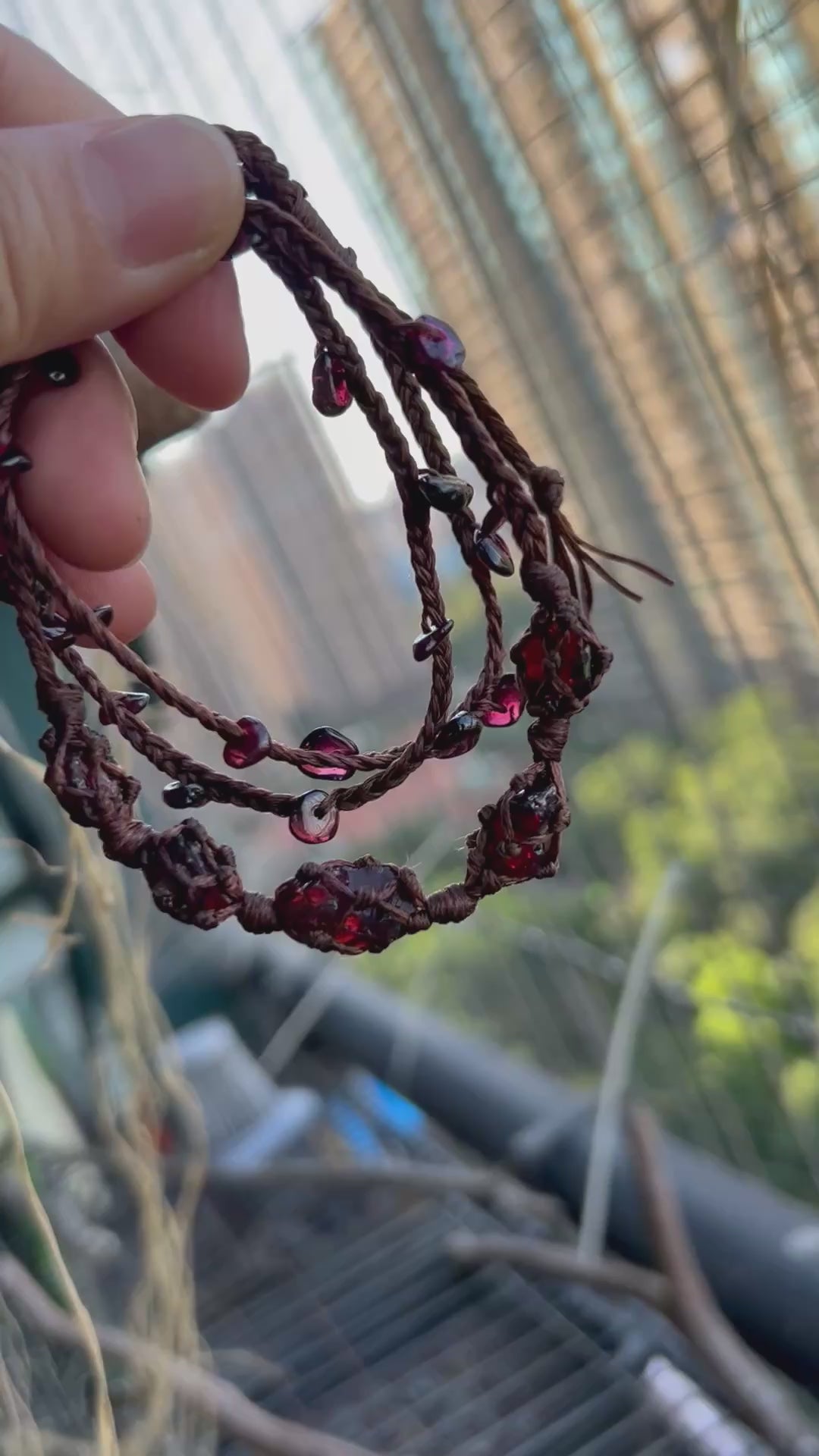 This stunning bracelet features three strands of hand-woven cord intricately wrapped with tumbled garnet stones. The deep red color of the garnets adds a touch of elegance and sophistication, while the natural hemp cord provides a comfortable and earthy feel. It is a unique and stylish accessory for any occasion.